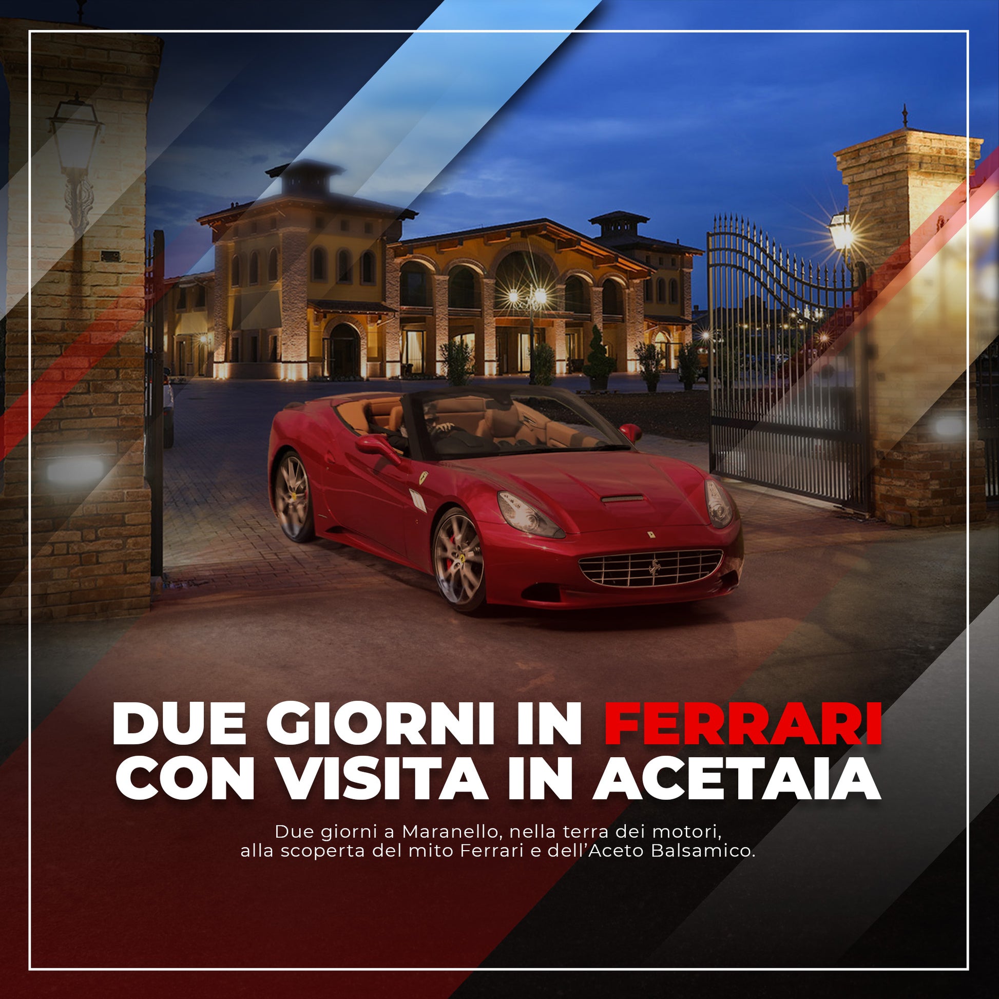 Il tour comprende un'esperienza alla guida di una Ferrari California lungo le strade di Maranello, visite ai musei Ferrari di Maranello e Modena, pranzo e visita guidata all’Acetaia Leonardi di Modena, con degustazione.